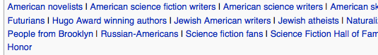 A quick trip to wikipedia shows that both are american sci-fi authors. The awesome thing is that wikipedia has a tail link that usually links to variations on your theme. i.e. in asimovs case, we have: