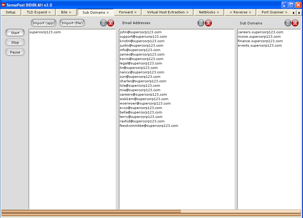 Using BiDiBLAH, you can easily find out what email addresses can be allocated from the internet, as well as which DNS names are associated with your domain. Assuming your domain is called supercorp123.com, BiDiBLAH can generate the following within 5 minutes