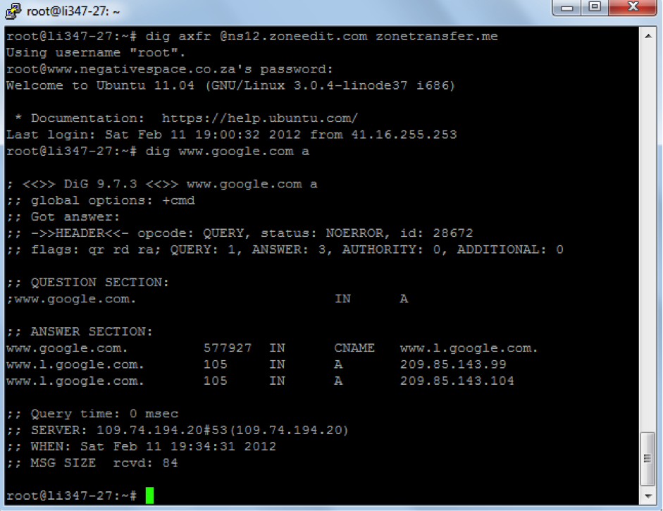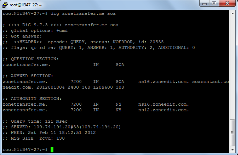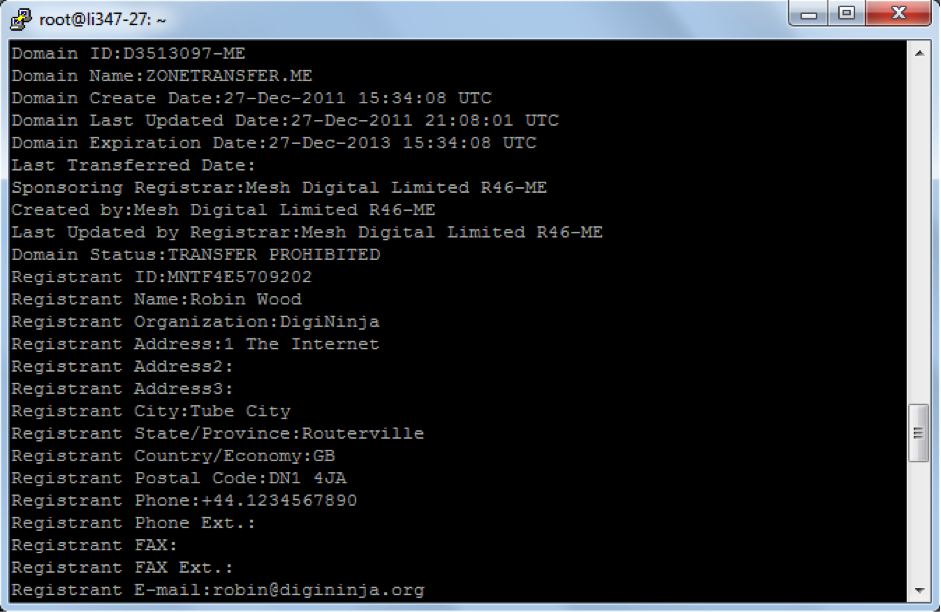 If, by verifying the SOA, it is confirmed that the domain exists, then the next step is to track down who it belongs to. At this point the whois service is called upon. ‘Whois’ is simply a registry that contains the information of the owner of a domain. Note that it is not entirely reliable and certainly not consistent. The following very simple query “whois zonetransfer.me” provides us with the owner of the domain “zonetransfer.me” detail.