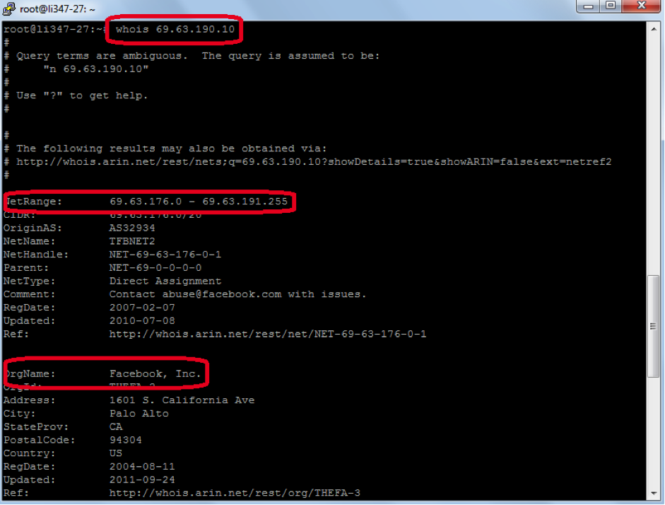 All this fuss with DNS is important, but it is only useful insofar as they lead us to addresses. The next step is discovering where the target exists within the IP address space. Luckily useful tools and resources exist to help us uncover these ranges, by automating a combination of manual techniques such as whois querying, traceroute and netblock calculators. In the previous section the whois tool was used to get the domain owner information. The same tool can be used to discover the ownership/assignment details of a specific IP address. Let’s take www.facebook.com; one of the IP addresses that it resolves to is 69.63.190.10. “whois 69.63.190.10” produces the following output.