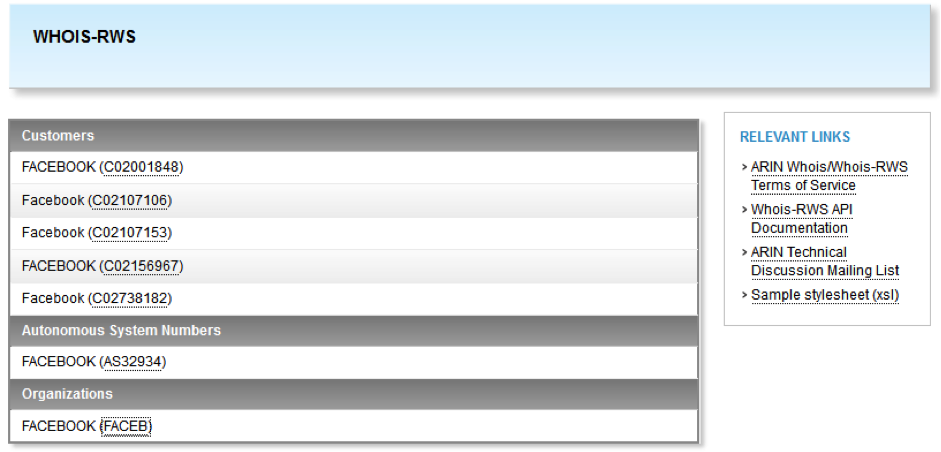 From the whois output we get really useful information. First is a netblock range 69.63.176.0-69.63.190.255 as well as the owner of this net block, namely Facebook, Inc. In this case we are lucky and the netblock is registered to facebook, but often you will only get the network service provider to which the netblock is allocated to. In that case, you will have to query the service provider in order to gain more info about the specific netblock. Online resources can also be very useful, for example ARIN (American Registry for Internet Numbers) or any of the other regional registries (RIPE, AfriNIC, APNIC and LACNIC) provides a reverse whois search interface where one can search for organisation names and other terms, even performing wild card searches. Giving Facebook a second look, we try a search on the reverse whois interface found at http://whois.arin.net/ with the term “facebook”, and get a list of five additional network ranges.