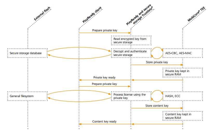 The trustlet receives client supplied memory addresses as input data which could be manipulated by an attacker. We’ll test this attack later. The captured PlayReady session involved 18 command/response pairs that correspond to the following high level diagram of PlayReady DRM algorithm published by G&D. I couldn’t find more detailed specification of the PlayReady DRM on the MSDN or other web sites. But at this stage, I was not interested in the implementation details of the PlayReady schema, as I didn’t want to attack the DRM itself, but wanted to find any exploitable issue such as a buffer overflow or memory disclosure in the trustlet.