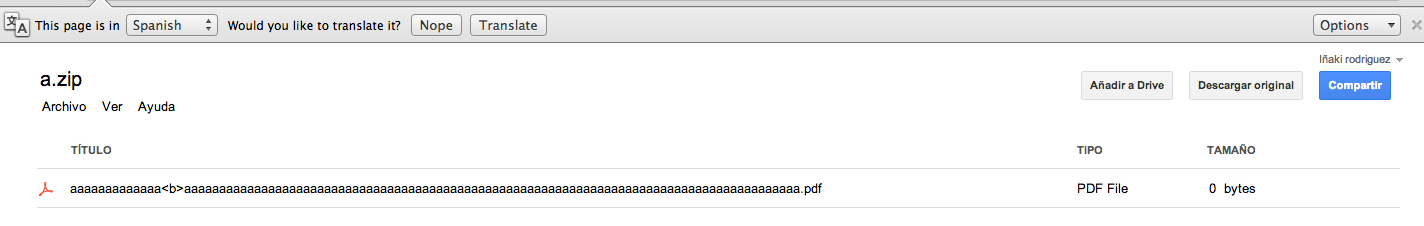 Remember that the zip format has the name of the compressed files twice. Google uses the first one (ZipFileRecord) for displaying the file names, but in the vulnerable page it uses the second one (ZipDirEntry).