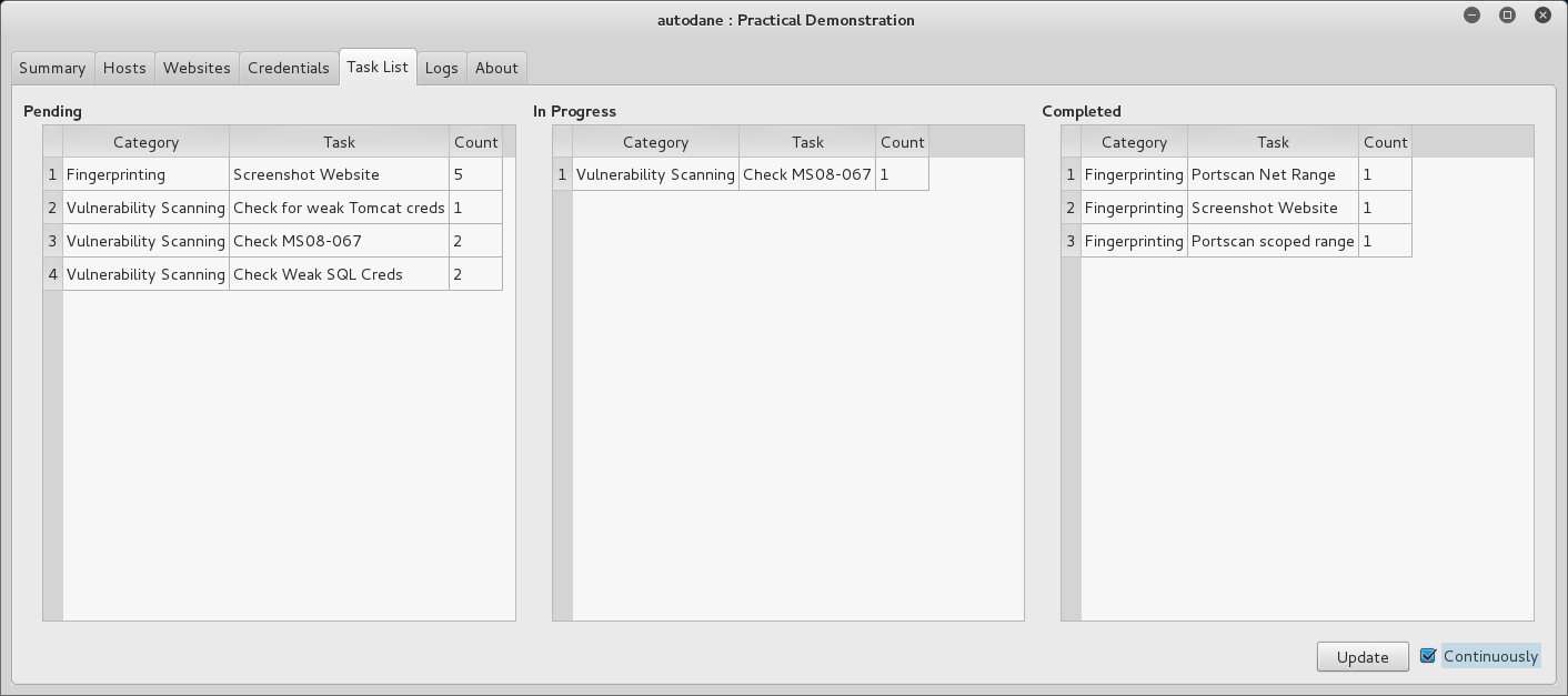 These exploit vulnerabilities found in the previous phase, and gather as much information as possible from the hosts, such as impersonation tokens, local user hashes, credentials stored by the Windows Local Secret Authority, and credentials stored in memory. The primary focus of this phase is to collect credentials, however, you can always feed autoDANE your own creds if you prefer.