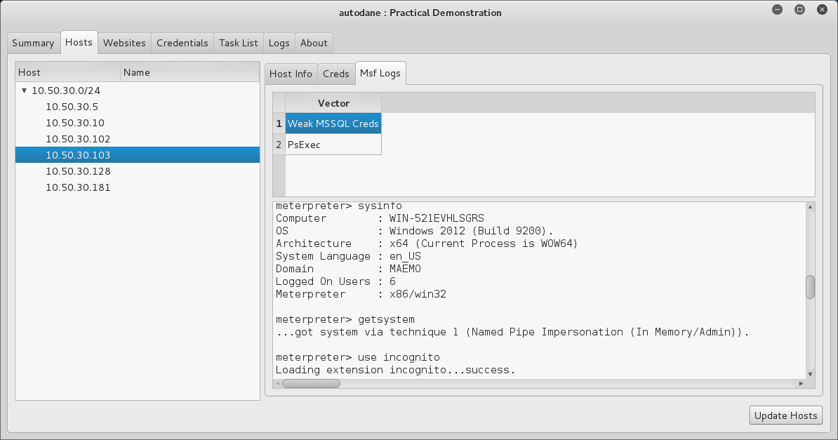This section is the primary focus of the project. It takes both the local and domain credentials found on other hosts, and retries them across the footprint. When credentials are found to allow access to new hosts, Metasploit’s PsExec module is used to gather password hashes, credentials and impersonation tokens. New credentials are fed back into the process, and it is repeated until autoDANE has escalated itself as far as it can.