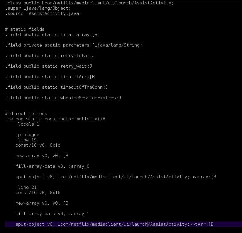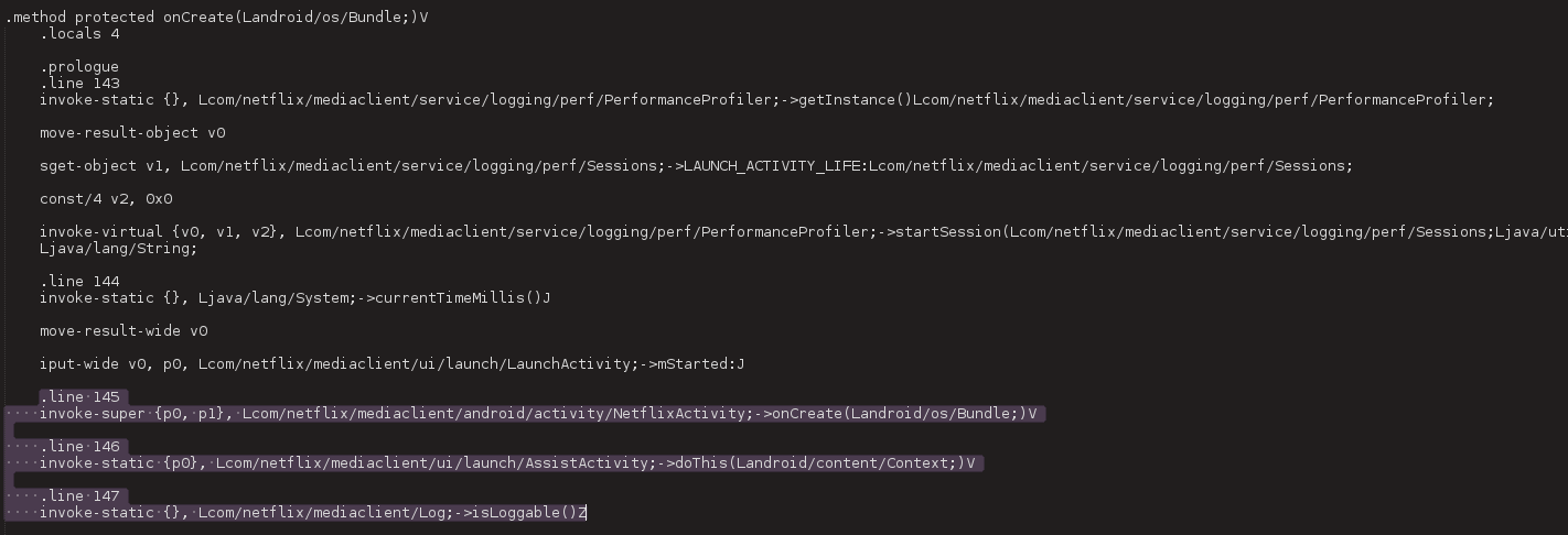 At this point we now have our two Smali files in the target directory and we now need to configure the target Activity(Netflix) to call our code. We will now modify “com.netflix.mediaclient.ui.launch.LaunchActivity” to call AssistActivity which in Java looks like: