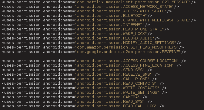 Okay so we can get meterpreter but what can we do with it? Lets try access the device’s camera and microphone using the vanilla permissions that are from the Netflix application (note here that we have not added or removed permissions from the Netflix app, merely injected our malicious code). What happens at this point is that you won’t be able to stream the devices camera as the AndroidManifest.xml does not request this permission BUT what permissions does the Netflix app ask for?
