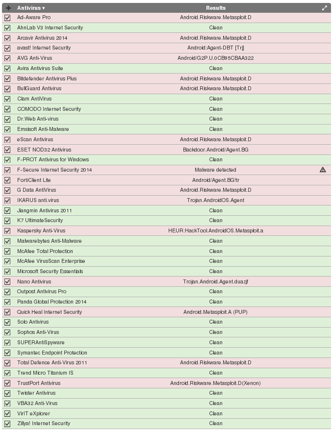 Easy peasy lemon squeezy. Now we have an Android application which will give us a meterpreter session on a victim device . How does this payload appear to AV’s on the mobile space seeing as our endgame is to avoid detection by AV? According to our analysis, beard.apk is detected by 17/41 AV vendors. Hmmmm not 100% FUD but also worrisome, this payload is not new or anything special so I would have expected 100% detection but then again, “mobile cyber” is different, I guess.