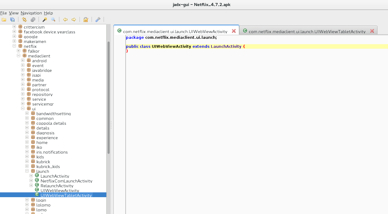 From the figure above, we can see that the two identified entry points both inherit from “com.netflix.mediaclient.ui.launch.LaunchActivity“. This means that when Netflix is executed, this activity is eventually executed, so this is our injection point, the class which we are going to tell to execute our payload.