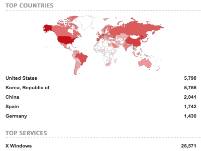 Now that we had a method of detecting this, like any good hackers, our next thought was to scan the whole Internet. But, before we got carried away, we thought we should scan the Internet country by country, starting with our home country, South Africa. We used masscan to quickly enumerate hosts with any X server ports open, then gave this list to nmap using our custom script with the unsafe flag off. This ended up being quite disappointing. We found four vulnerable hosts, of which three had no desktop environment running (or possible with an active screensaver) and one gave us a view of the user’s desktop. However, a quick look at Shodan with this search tell us that maybe this isn’t true of all countries.