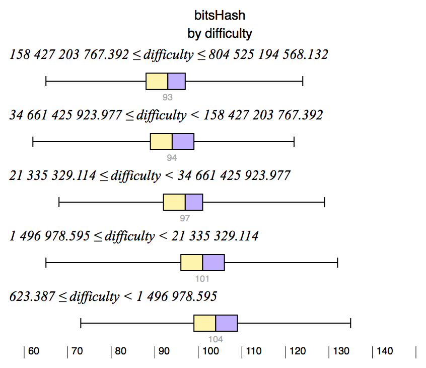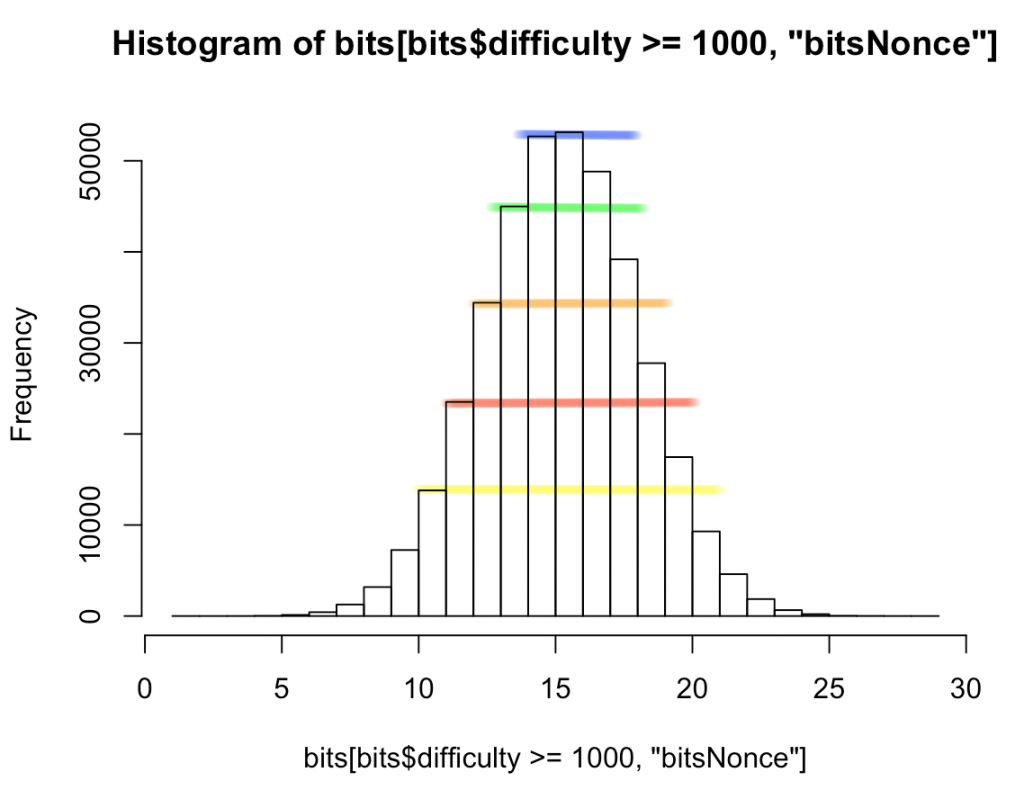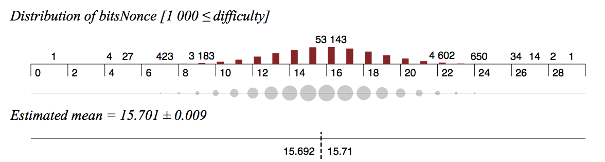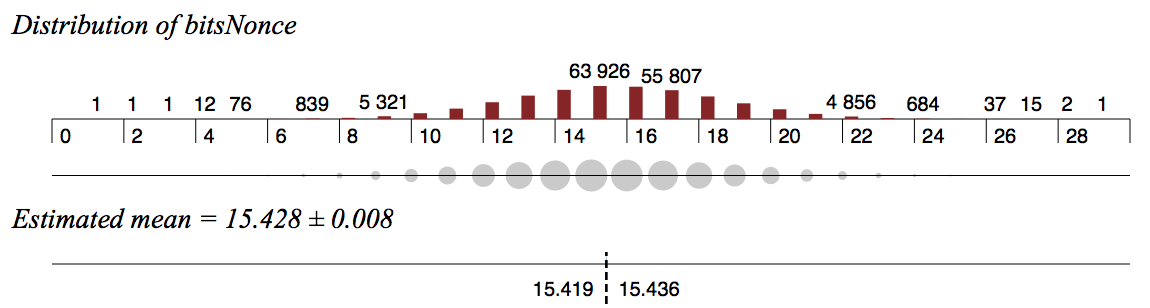What is happening to cause this? It is probably caused by the fact that the sparsity of bits set in the input to the SHA256 hashes coupled with the particular selection of outputs (also with fewer bits set than the expected mean) resulted in a bias towards even fewer bits in the input values. Since the nonce (and in a lesser manner, time and Merkle root) are the main variables in selecting the “winning” blocks, this results in fewer bits set in the nonce than random chance would explain.