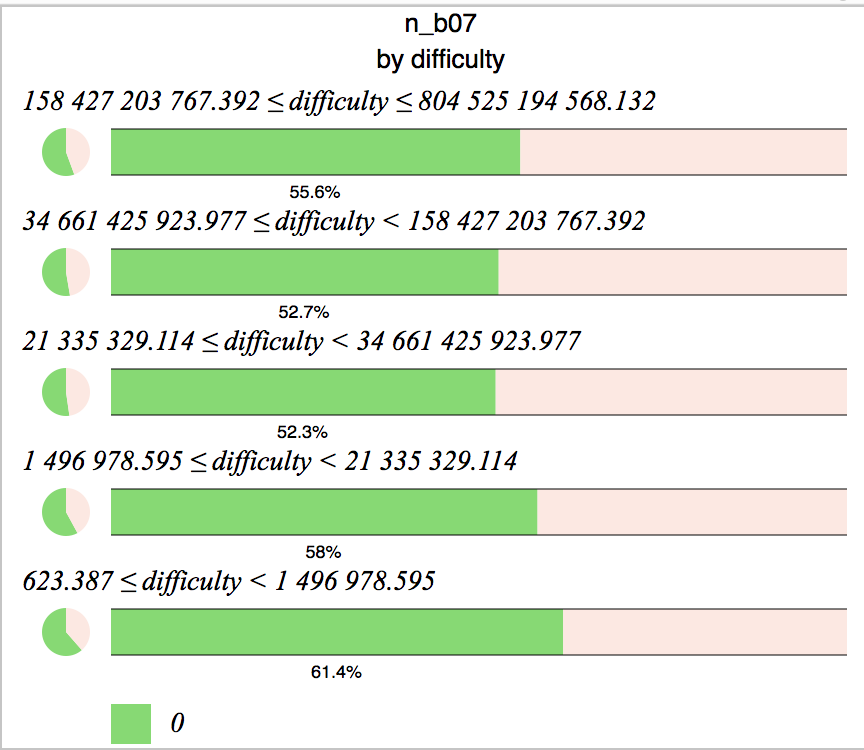 Studying the values of the individual bits making up the nonces is even more interesting. To appreciate the effect, here is what the value of the LSB of the time value looks like as the difficulty increases: