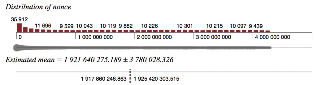 The nonces in this later set follow a much flatter distribution, and if they were randomly chosen, for a set this large, the expected mean number of bits set in the 32 bit nonces should be extremely close to 16. The actual mean number of bits set is 15.701, which a highly significant deviation from the expected value:
