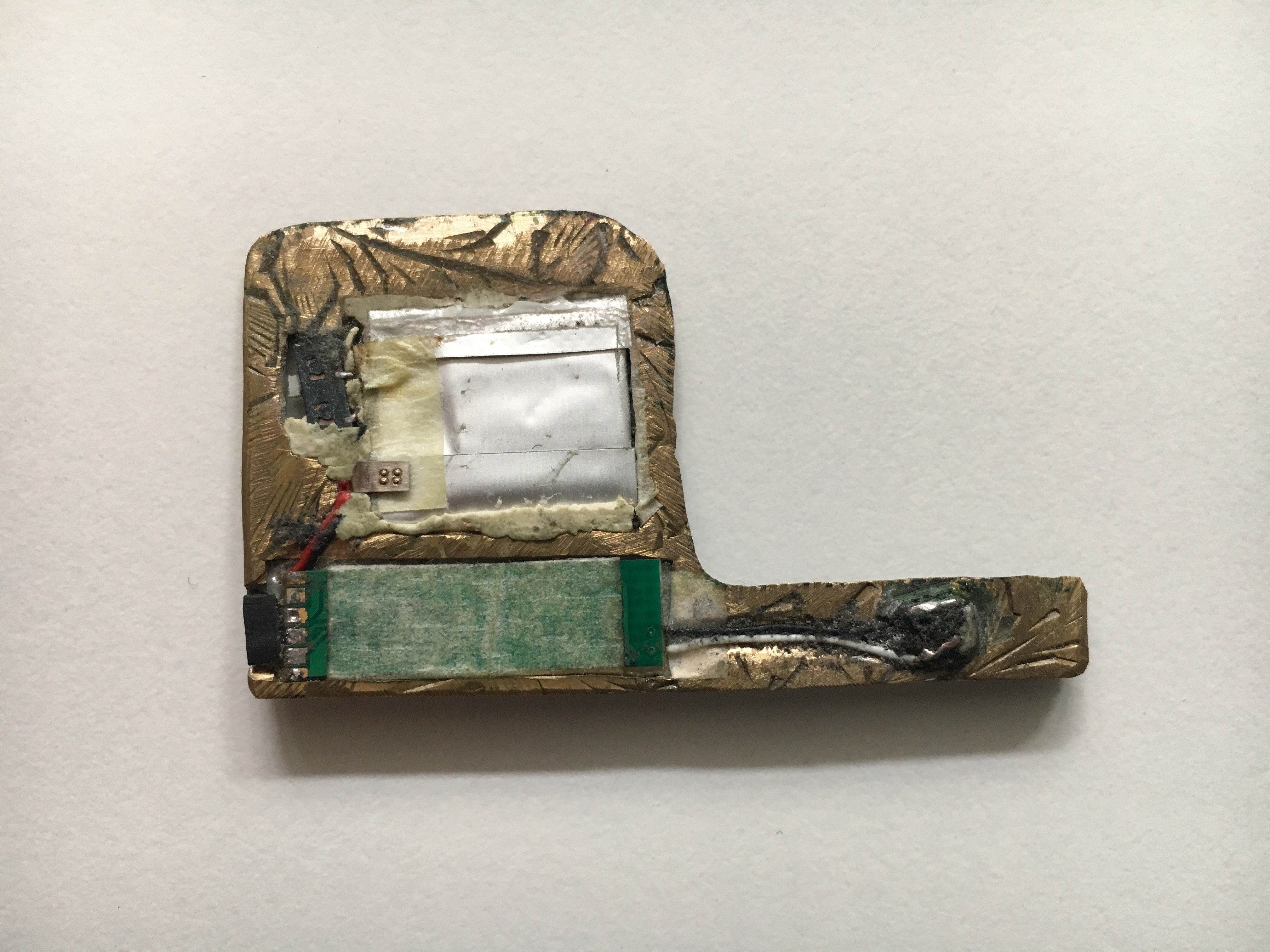 This is the bottom of the card reader, as you can clearly see it has a switch, a connector, some kind of PCB and a Analog Mag strip reader. most parts that are conductive are covered by masking tape. Taking a closer look at the “Brass” holder, it looks to be some kind of engraved brass picture frame or plaque, some parts even look filed to shape by hand for better fit into the machine and some parts are just super glued into place (wires).
