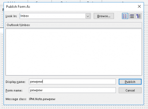 Once published, the form gets a new form name and its own message class. The message class is important, as Outlook will use this to determine which form to use when processing a message and displaying it. If the form gets published into a folder such as the Inbox, it automatically gets synchronised with the Exchange server, and all instances of Outlook associated to that account!