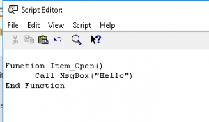 Once you open up the code viewer, you will see a very basic text editor with two options under the script menu, namely Event Handler and Object Browser. That is it, you need to figure out the rest by yourself (unlike the nice VBA editor that ships with Office). Selecting the Event Handler pick the open option and VBScript will be inserted to handle the on_open event for this form.