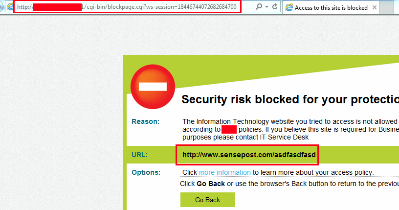 In the first image, when the web server redirected to a valid web address, with a different path, the blocked message contained the full redirection URL and path.