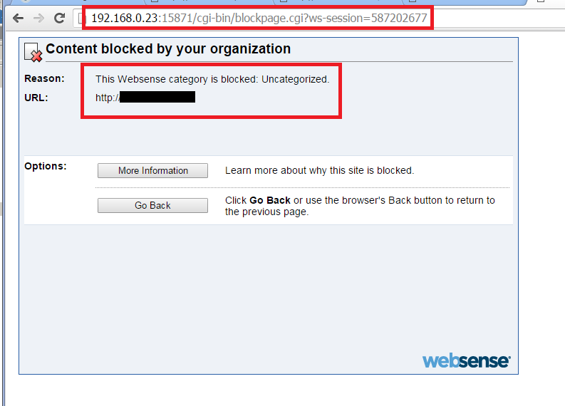 When visiting the external server, a blocked message was received from Forcepoint indicating that the category was not allowed. This is fine, it is the intended behaviour and you need not worry about this message. The “payload” was still successfully sent and received.