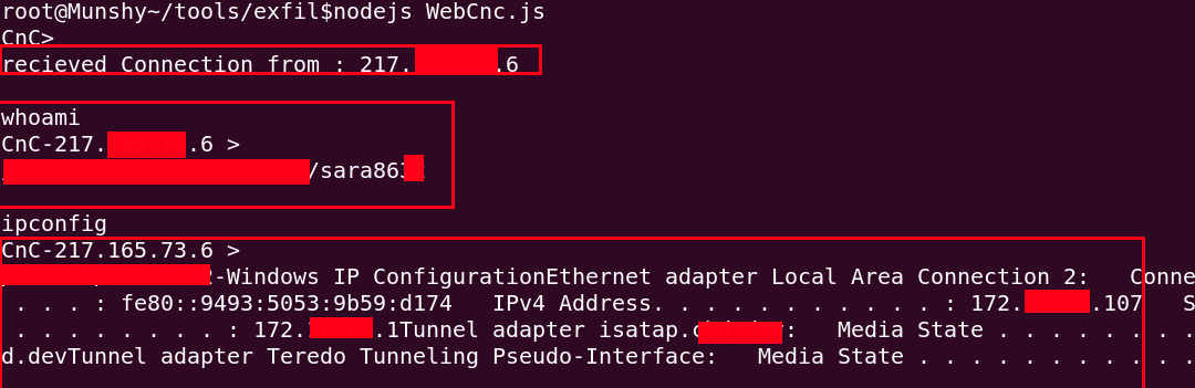 A PowerShell script was developed that beacons back to the web server, and the server responds with a redirect to an invalid domain. If the domain was ‘nocmd‘, then no action was taken, if it was anything else, such as ‘whoami‘ the domain, or command, would be updated by the server on command entry on the terminal, execute it and return the results back to the web server using the method discussed in the first section of the post.