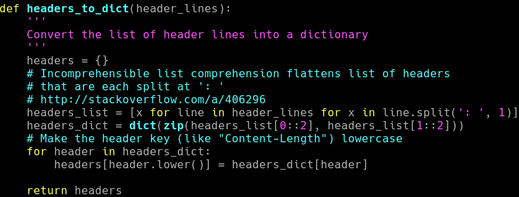 For instance, the following header line “Content-type: text/html” would be split into [‘Content-type’, ‘text/html’]. All key value pairs are added to a dictionary, which is then sent back for further processing.