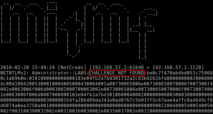After closer inspection however, I noted that most of the hashes were missing their challenge portion of the NTLMSSP challenge response. The challenge portion was simply replaced with the text “CHALLENGE NOT FOUND”, while the response was duly present.