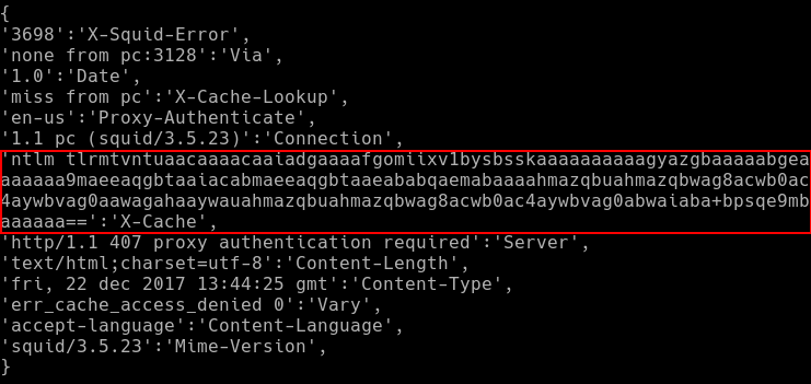 All the key and value pairs in the resulting dictionary were mismatched, with some of the header values acting as keys, and vice versa. Specifically, the Proxy-Authenticate value which contains the NTLMSSP challenge was incorrectly assigned as a key.