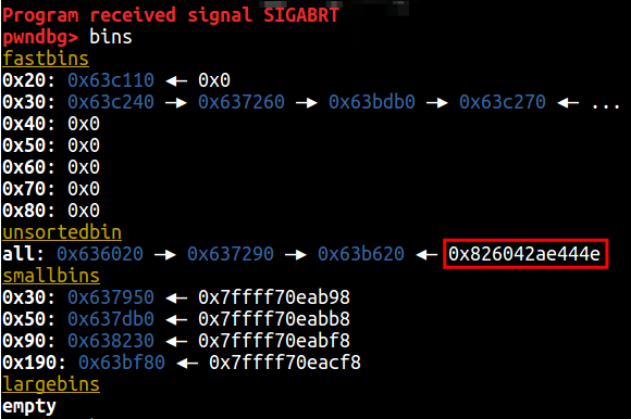 Cool! We can control stuff but, why? On this specific case we are overflowing into a free chunk right from the chunk that’s behind 0x63b620 (flashbacks to villoc!). We are overwriting enough to get to the FD pointer of that chunk but, in the end, it will not be possible to “fool” the allocator because of the implemented checks in malloc.c.