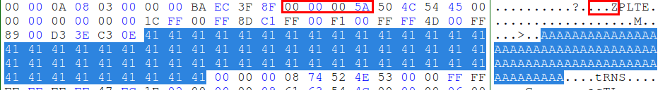 See that the size change was done from 0x18 to 0x5a so we need to fill the PNG chunk’s data with further 0x5a - 0x18 bytes, hence AAAAA....