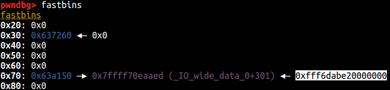 Being, 0x70 the allocation we want to trigger, 0x08 for the meta-data of the chunk and 0xc the value that gets subtracted in the code. This should generate a fastchunk of size 0x70.