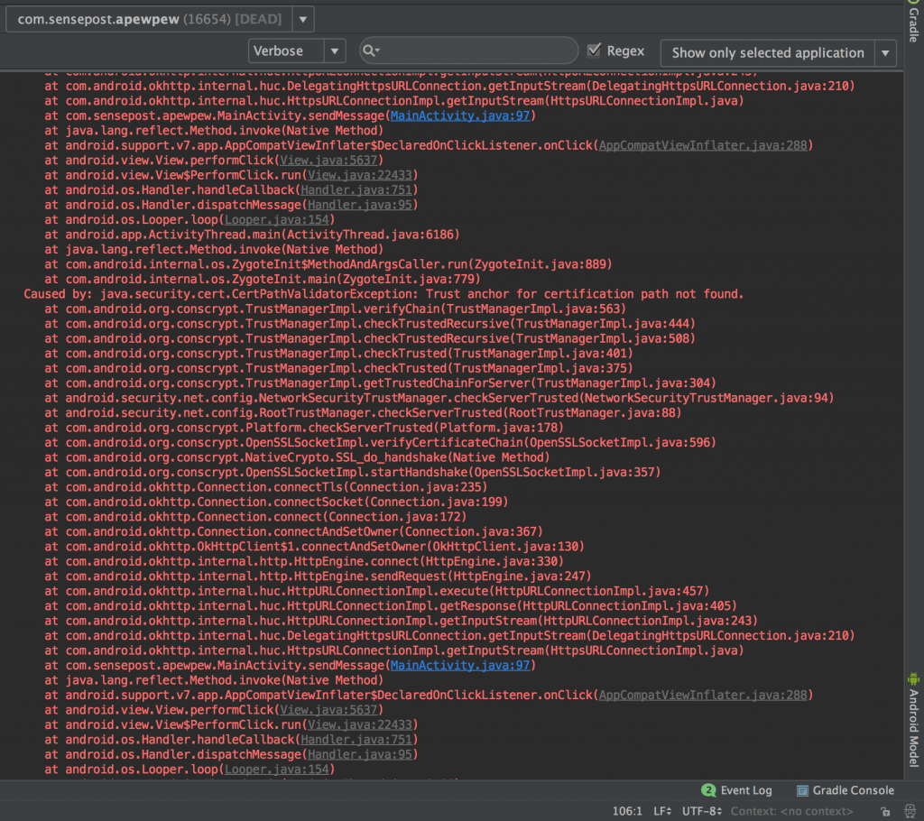 Getting a stack trace was easy. I simply removed the networkSecyrityConfig changes I had made earlier to my sample app and ran the app again with Burp’s interception enabled.