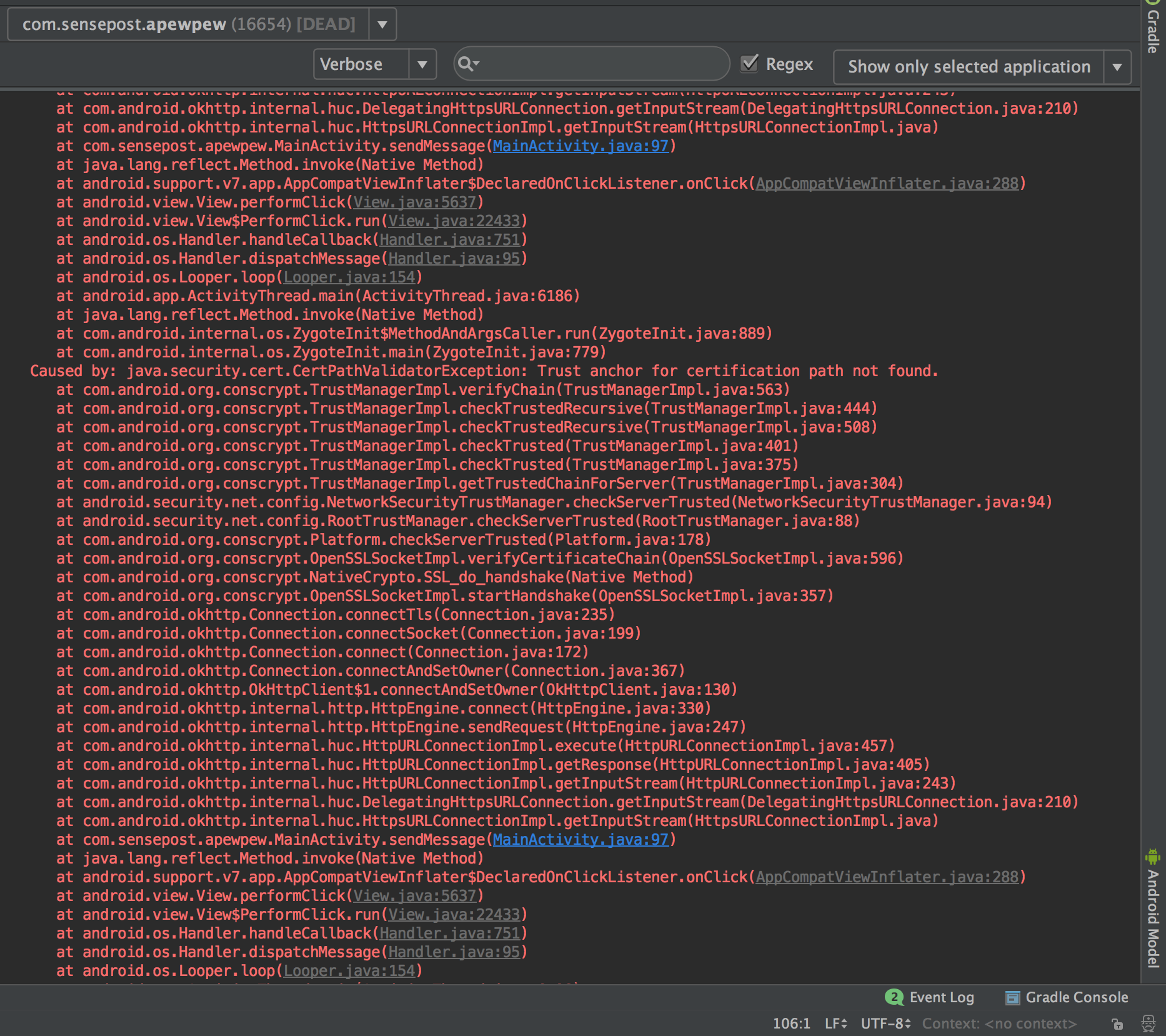 Getting a stack trace was easy. I simply removed the networkSecyrityConfig changes I had made earlier to my sample app and ran the app again with Burp’s interception enabled.