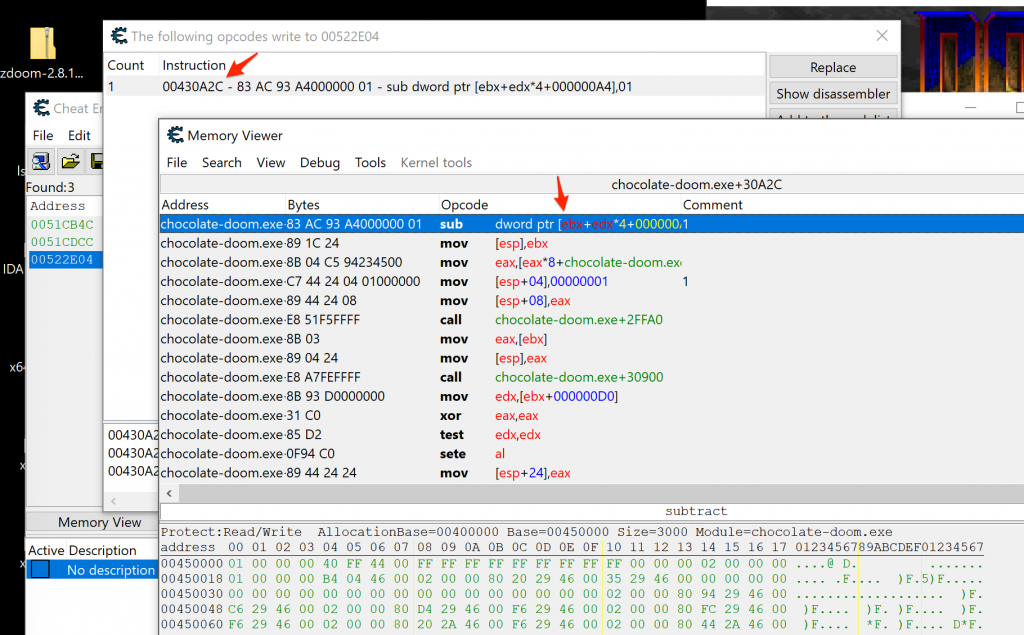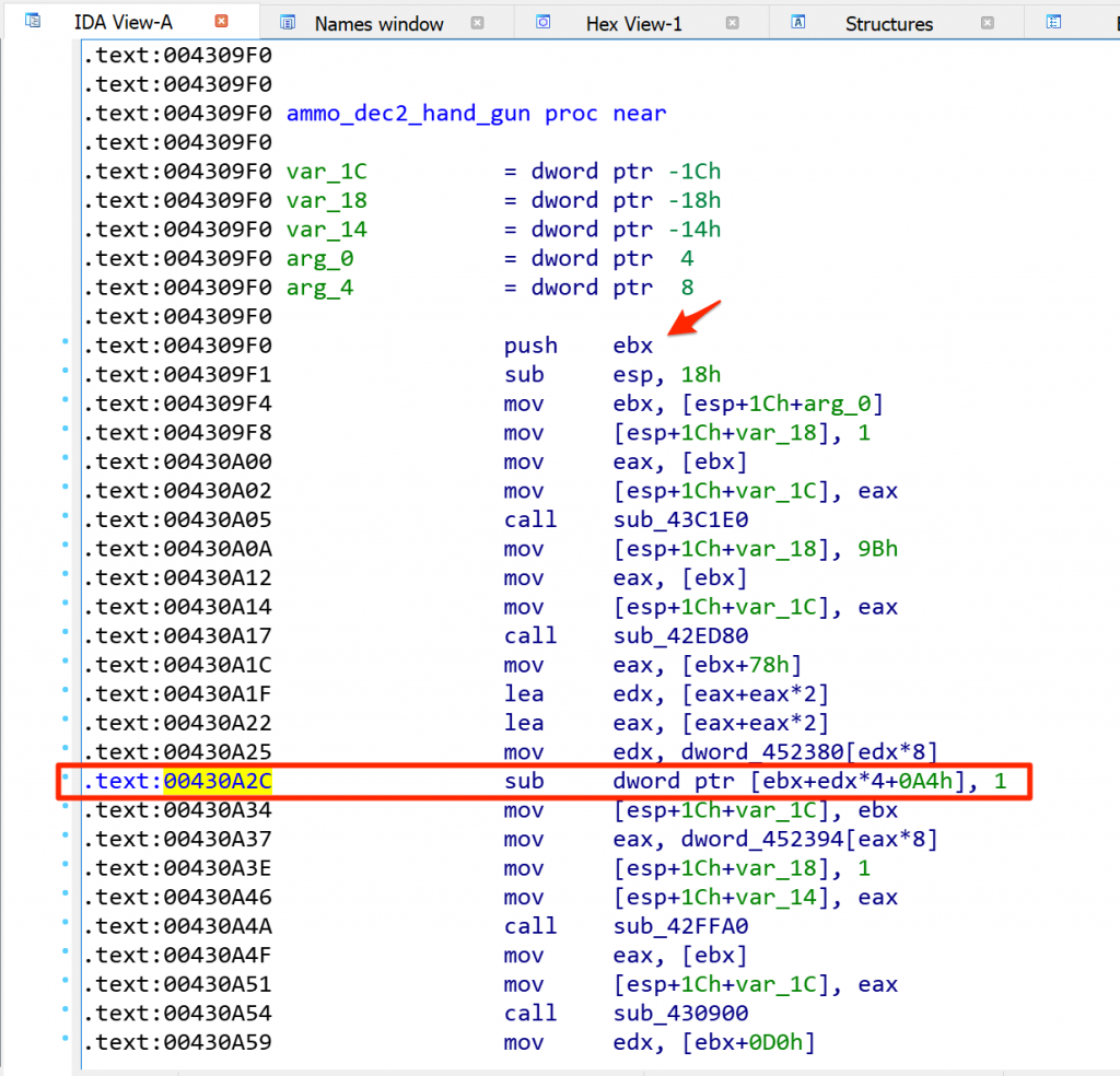 The third match we had saw writes only when the handgun was fired. The instruction was a subtraction by one and therefore likely the instruction to decrease the ammo count we are interested in. CheatEngine allows you to disassemble code around the identified instruction. Using this, we had the location of the instruction responsible for decreasing the ammo count when the handgun was shot at 0x0430A2c.