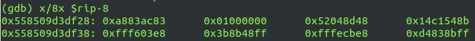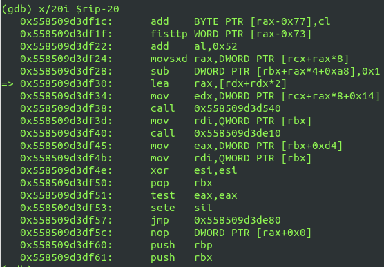 As you can see, there is a sub instruction just before where the instruction pointer is currently sitting. To search for the exact instruction in IDA, we viewed the hex value of the instruction in gdb.
