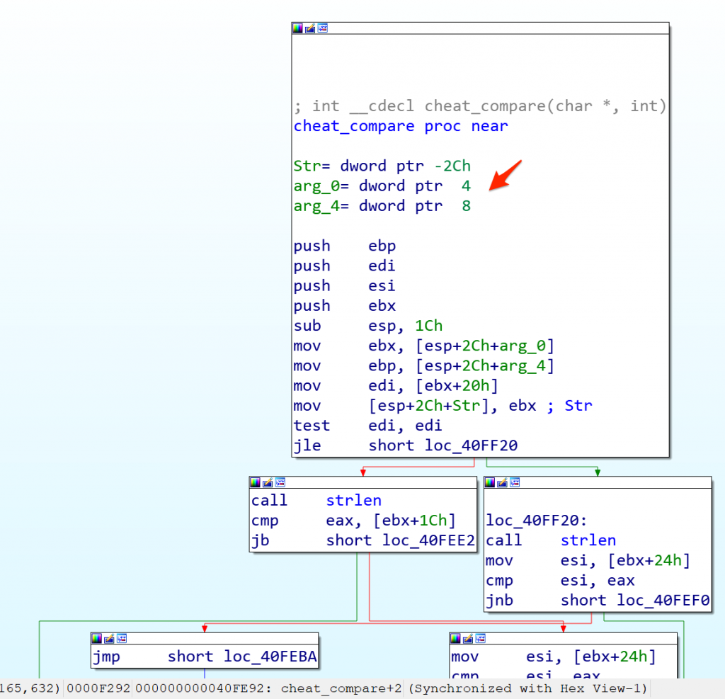 All of the different cheats branches also made a call to a function that lived at 0x040FE90. This function took two arguments, one being a character array and another an integer and appeared to be comparing a character to a string.