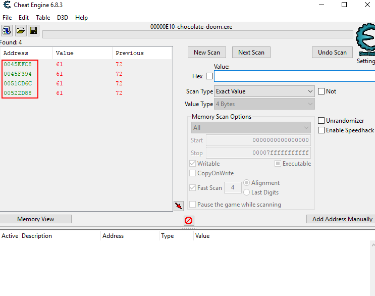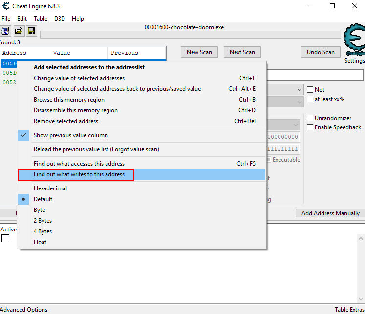 To pinpoint exactly the right location, we can can change the value a bit, and then rescan using CheatEngine for any instances of the previously found value that was altered by the same amount. We could do this by shooting the handgun a few times and taking note of by how much the ammo count was changed. We can then use the “Next Scan” function and the “Decreased value by” scan type option to search in CheatEngine for a value that has also changed by the same amount. This decreased the amount of possible locations for the ammo count to only three.