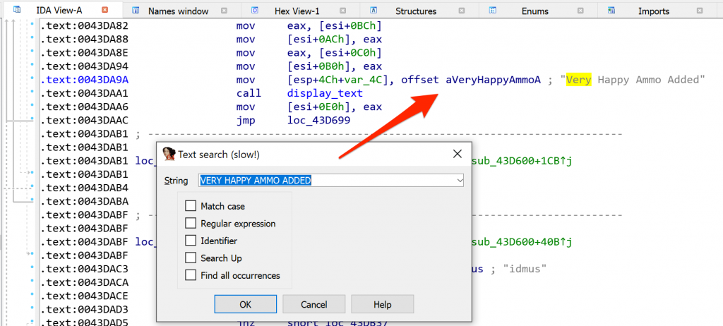 To implement this the chocolate-doom binary was analysed to find the logic that handles the current cheats. We knew that if you typed “idkfa”, the game would pop up a message saying “VERY HAPPY AMMO ADDED”.