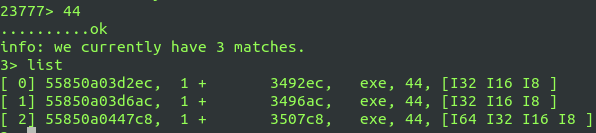 While not the primary target for our project, we also had a go at patching the chocolate-doom ELF binary. This was all done on an Ubuntu machine using similar tools as mentioned above, however, cheat engine was not available for Linux. Instead, to start finding interesting code paths in the ELF binary, we used a tool called scanmem which is similar to CheatEngine, but only gives the addresses of a value in memory and not which instruction alters it. After starting up scanmem and entering the changing ammo value a couple of times, it also isolated 3 possible addresses for ammo. These would change at each invocation of chocolate-doom because of the use of ASLR.