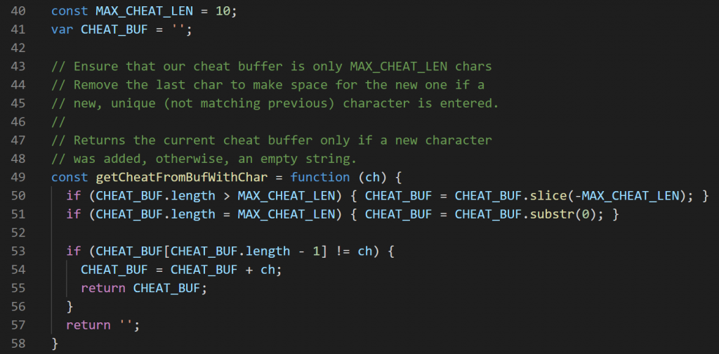 The cheat_compare method, admittedly, was a little confusing. We decided to use the keycode we got as an argument, but had to work around the fact that we would receive the same keycode a number of times as the method was repeatedly called for different cheats with the same keycode. As a result, we decided on simply recording unique keycodes . This introduced only one limitation; our cheats couldn’t have repeating characters. The result was a method that would check a character and append it if it was unique, returning the full recorded buffer if a new character was added.
