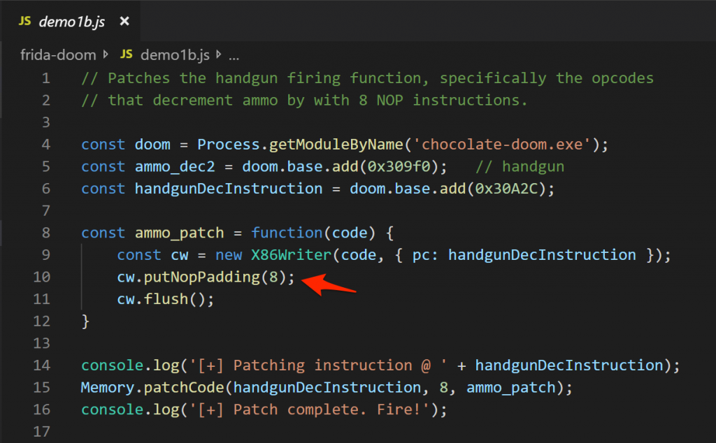 We figured we would start by writing a simple patch that just replaces the instruction to decrement the ammo count by 1 with NOP instructions. Frida has a Code writer module that can help with this. The original decrement instruction was sub dword ptr [ebx+edx*4+0A4h], 1 which is represented as 8 opcodes when viewed in hex.