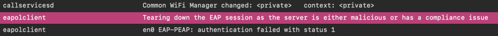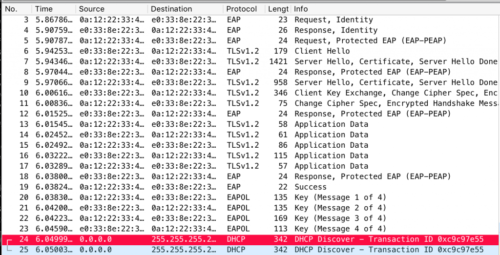 That said, the way Apple fixed this confuses me to no end. Devices that have been patched exhibit the exact same behaviour at a PEAP, MSCHAPv2 and WPA2 level i.e. the device still connects to the network, and in some cases will even request DHCP. Here’s an example:
