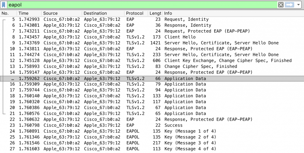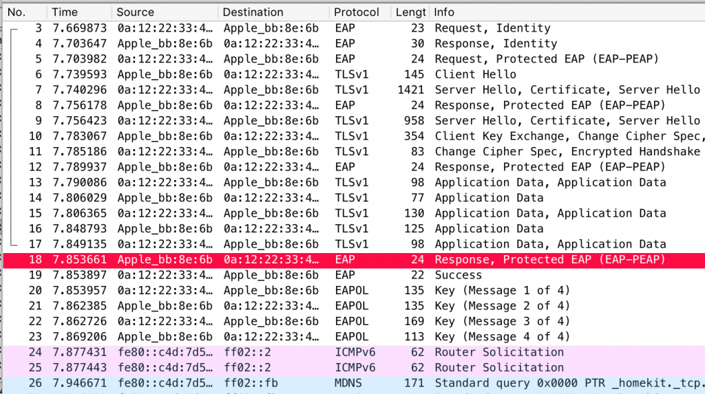 Earlier, when introducing PEAP, we said that by default (i.e,. if there’s no cryptobinding), the pairwise master key used for starting the WPA2 4-way handshake is taken from the outer TLS session. The authenticator sends this to the AP at this point, and the AP and Apple device happily complete the 4-way handshake and the device connects. Here’s an example: