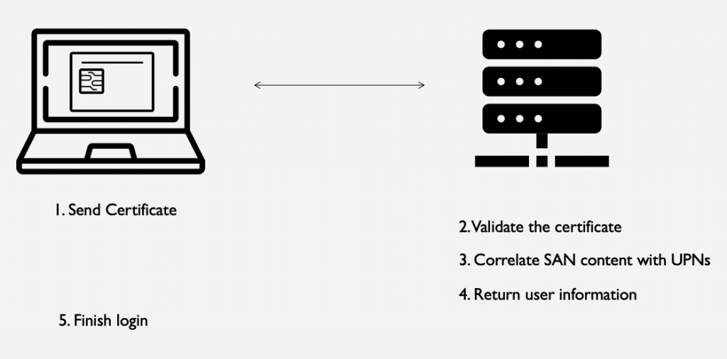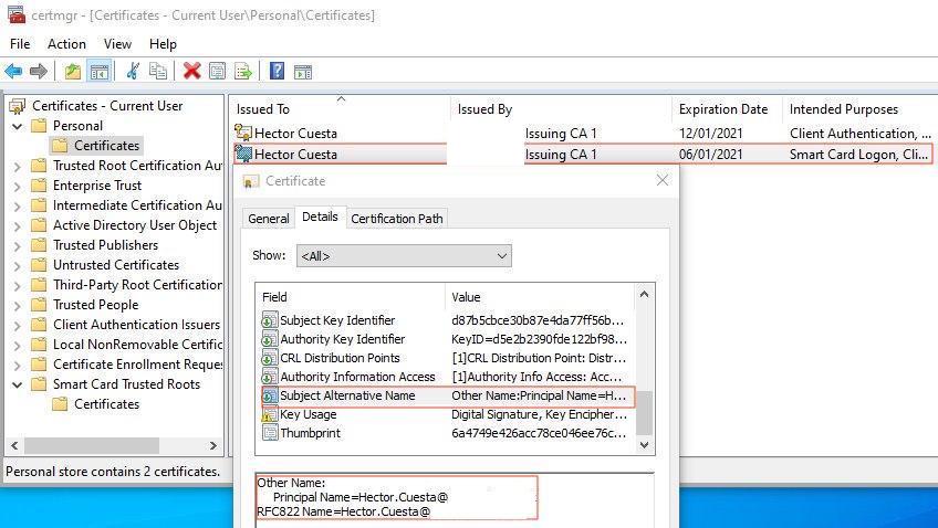 All smart cards contain a certificate with multiple values, one of them being the Subject Alternative Name (SAN). This field contained the email of the user that owned the card, so, for example “hector.cuesta@contoso.local”. To access the certificate on the smart card, the user needed to enter a PIN number validated against the one stored on the smart card. Every time the user wanted to login into their computer, they need to first introduce the smart card and then enter the pin.