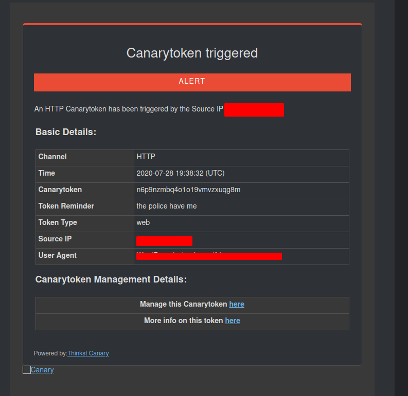 The script itself doesn’t do much aside from curling a canary token. The canary token works great here since you can send the alert notification with very minimal infrastructure and without indicating who has been alerted. Once the token is triggered, an email similar to the one shown below will be sent to the recipient of the token.