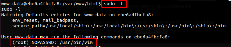 Having run sudo -l on the web server we saw that the www-data user was allowed to run vim as root. Vim is a text editor that gives one the ability to create and modify multiple forms of text. Vim can also run commands.