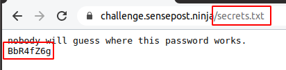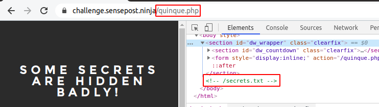 The fifth page contained several clues. This first clue was seen when we inspected the page’s elements. A commented out reference to a secrets.txt file.