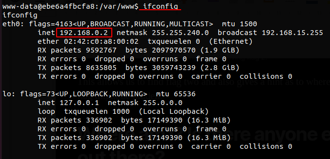 Having received a connection from the application we could have enumerated the webserver to find the user we were running as. Additionally, we would have found the location of the second flag.