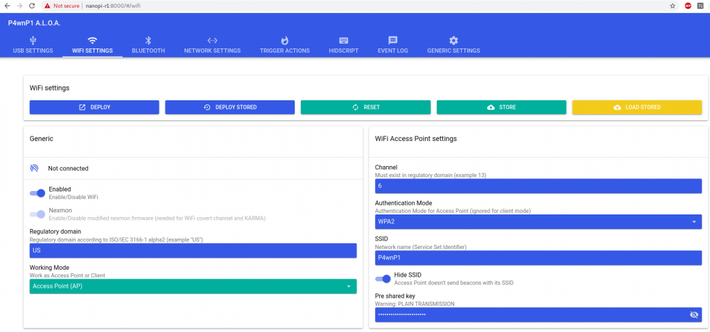 Now that P4wnP1 is running, you should be able to reach the P4wnP1 web interface at the same IP that you are SSH’d to, on port 8000. i.e. http://nanopi-r1:8000/. There is no authentication, because it is assumed that the network that P4wnP1 is exposed to is a trusted network.