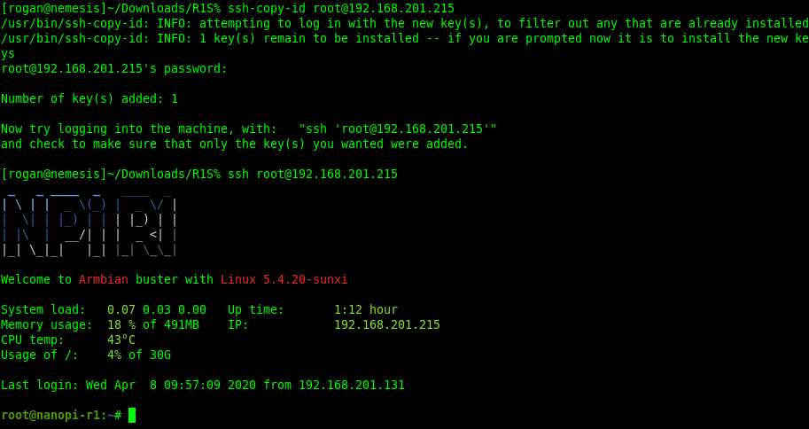 Now we can SSH to our R1S. I also copied my ssh public key, to make future connections simpler.
