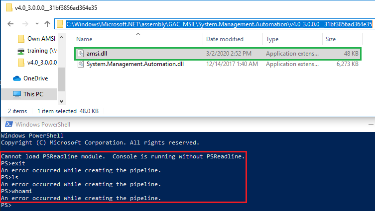 Even better, based on the DLL search order, PowerShell tries to load the AMSI DLL from the directory from which the application was loaded. This means as a low-privileged user, bypassing AMSI is therefore just a matter of copying the PowerShell executable and the AMSI DLL to a user-writable folder.